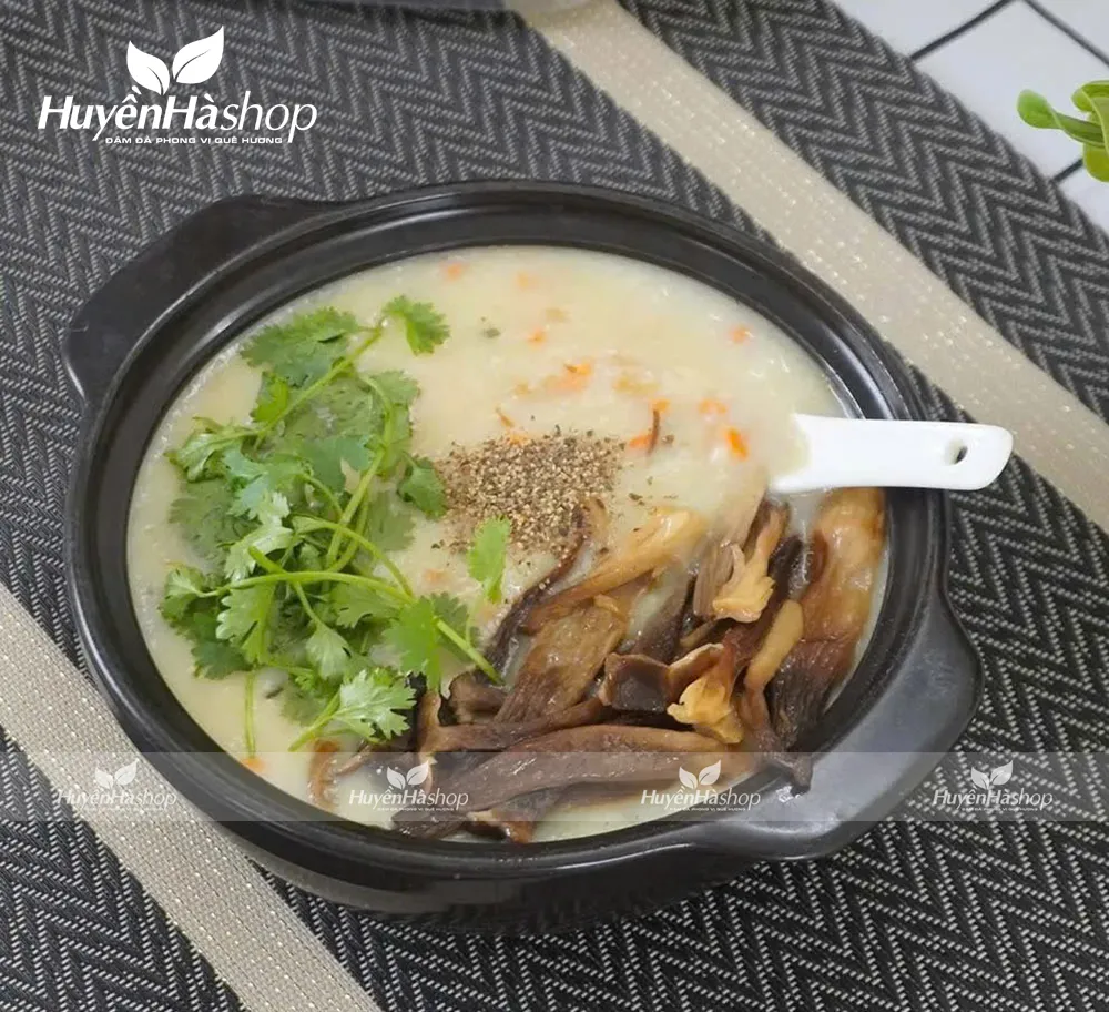 - Khi cháo đã nhừ, thêm phần nấm đã xào vào nồi, khuấy đều rồi đun thêm 3 – 5 phút.